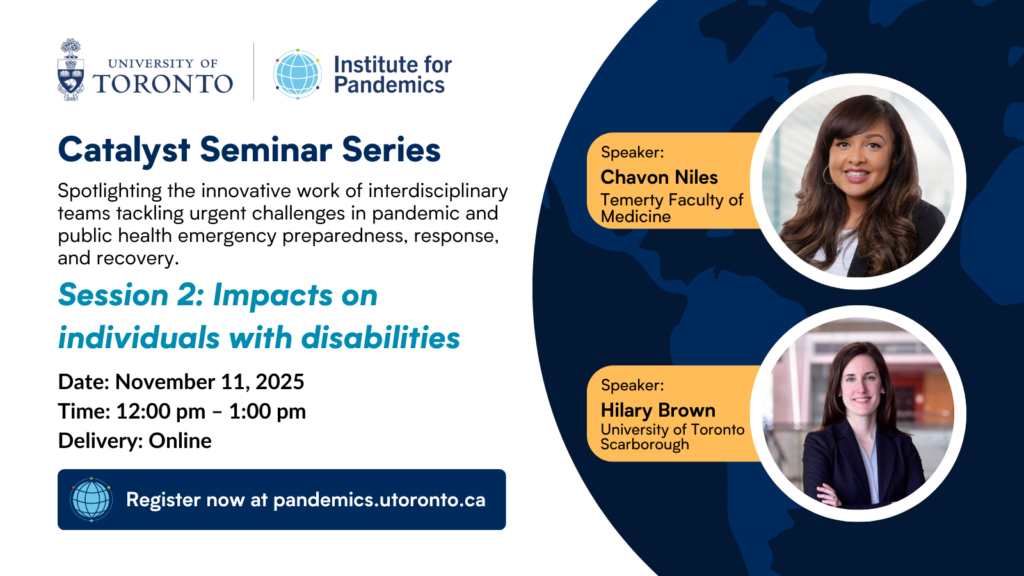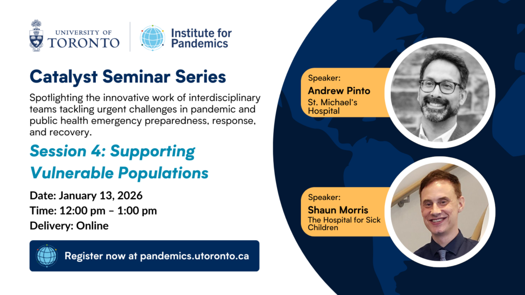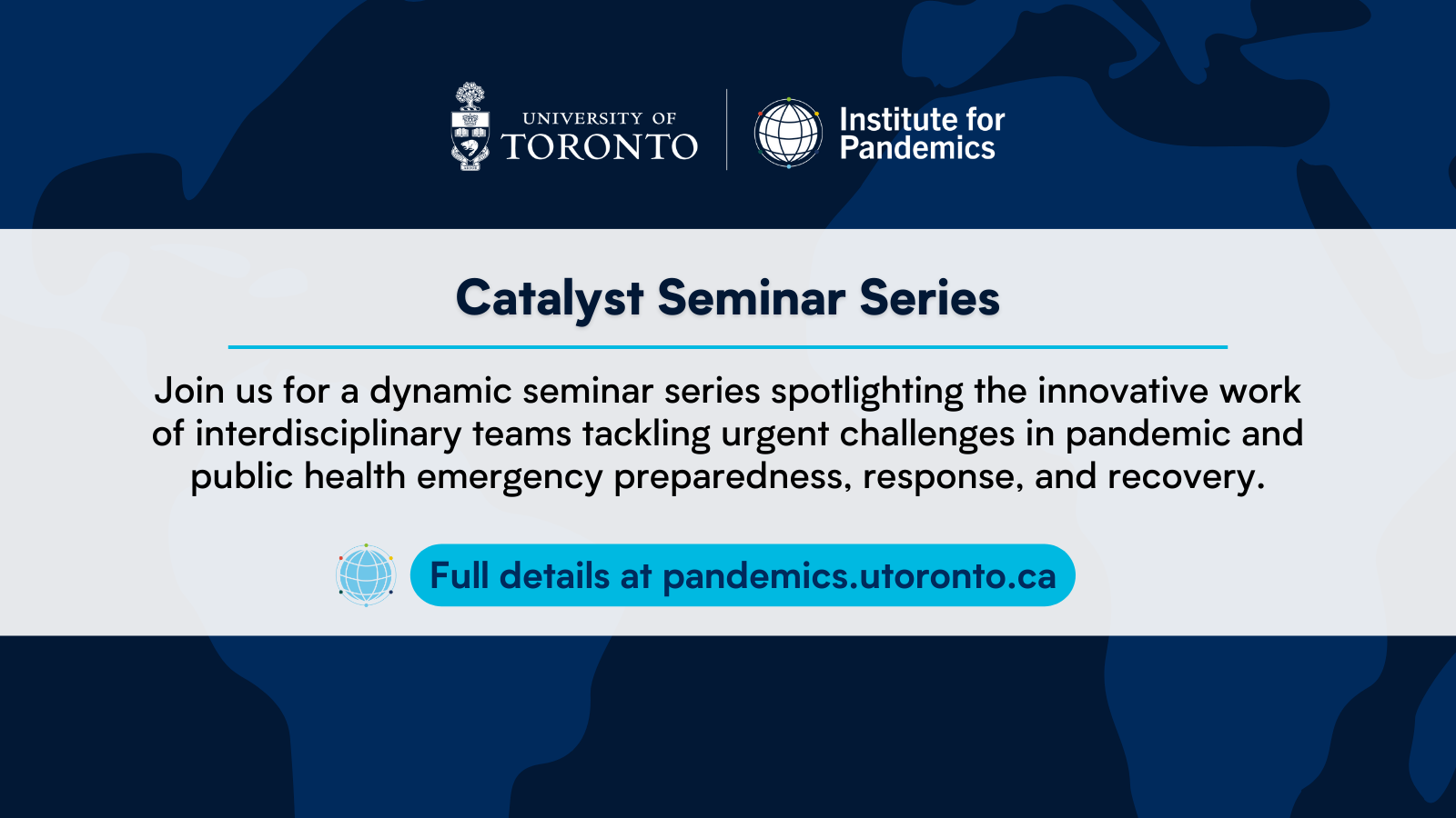 Join us for Catalyst Series, a dynamic seminar series showcasing groundbreaking research funded by the Institute for Pandemics' (IfP) Catalyst and Research Development Grants. Since 2023, IfP has provided over $1 million to research teams at the University of Toronto, to support collaborative, interdisciplinary research projects. These presentations spotlight the innovative work of interdisciplinary teams tackling urgent challenges in pandemic preparedness, response, and recovery.
